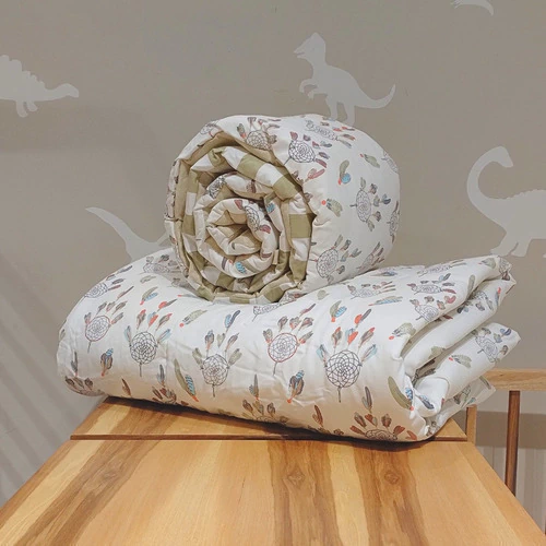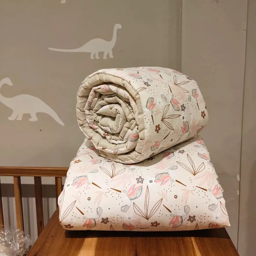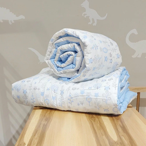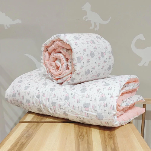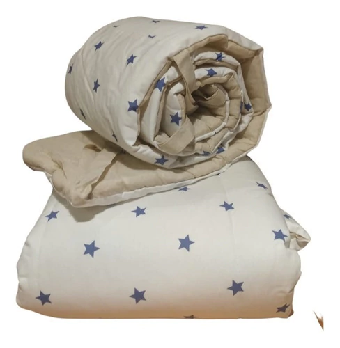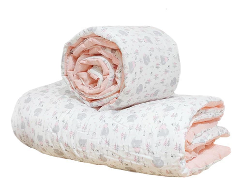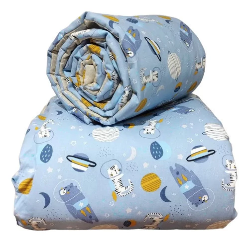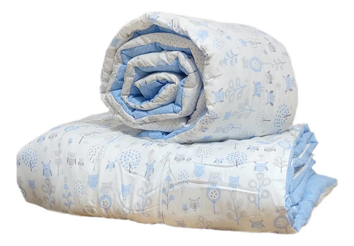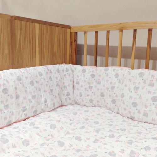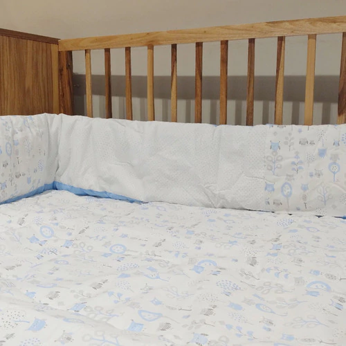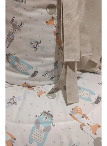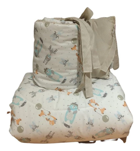 El acolchado es reversible de género piqué estampado combinado con microfibra estampada. Esta relleno de guata de 150 gr, el conjunto incluye acolchado y una chichonera larga que recubre media cuna.