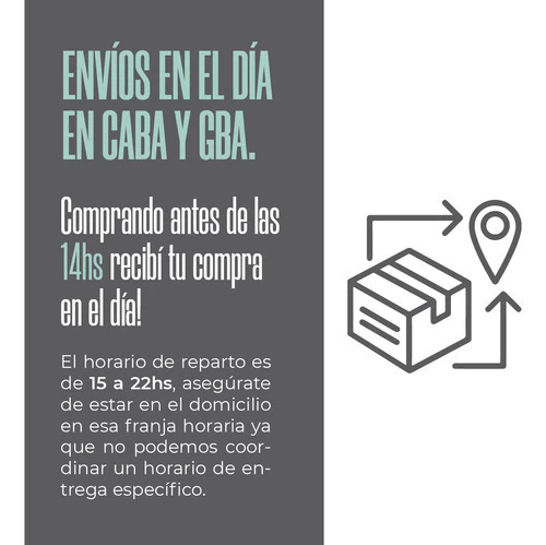 4) ENVÍO RÁPIDO A DOMICILIO: Válido para Caba y GBA. Todo lo que compres antes de las 14.00hs de lunes a viernes se entrega ese mismo día. Los Sábados entregamos todo lo que compres hasta las 12 del mediodía. Las entregas son de 15 a 22 hs sin excepción. Asegúrate de estar en el domicilio, si no te encuentran, se reprograma al día siguiente.
