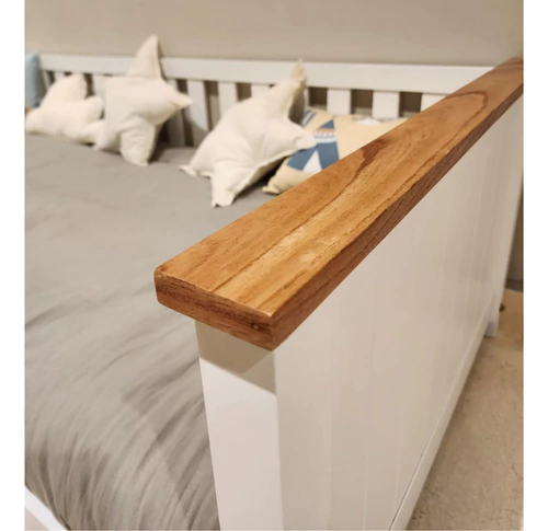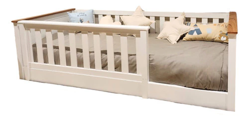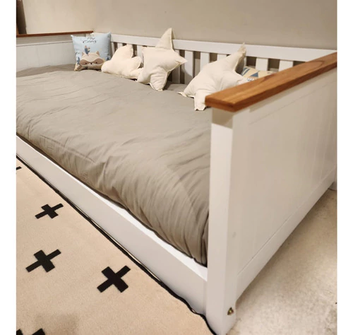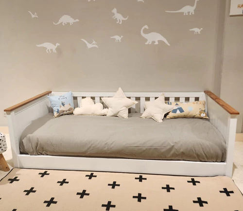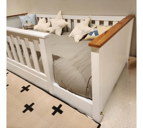 Cama Montessori de una plaza para colchón de 80x190cm, terminada en laca satinada blanca, cuenta con detalles de paraíso lustrado.
