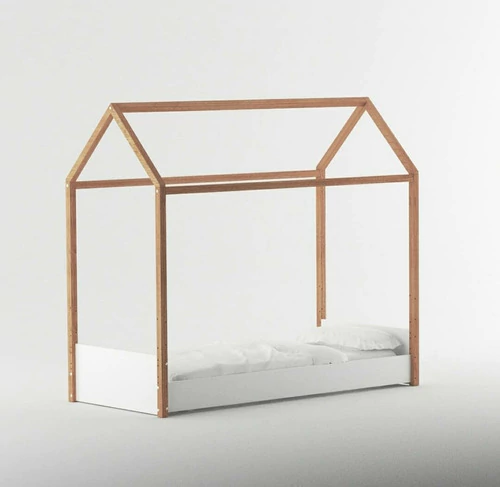 La cama estilo Montessori, cuenta con estructura de casita en madera maciza lustrada.