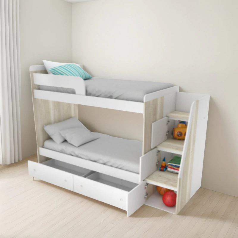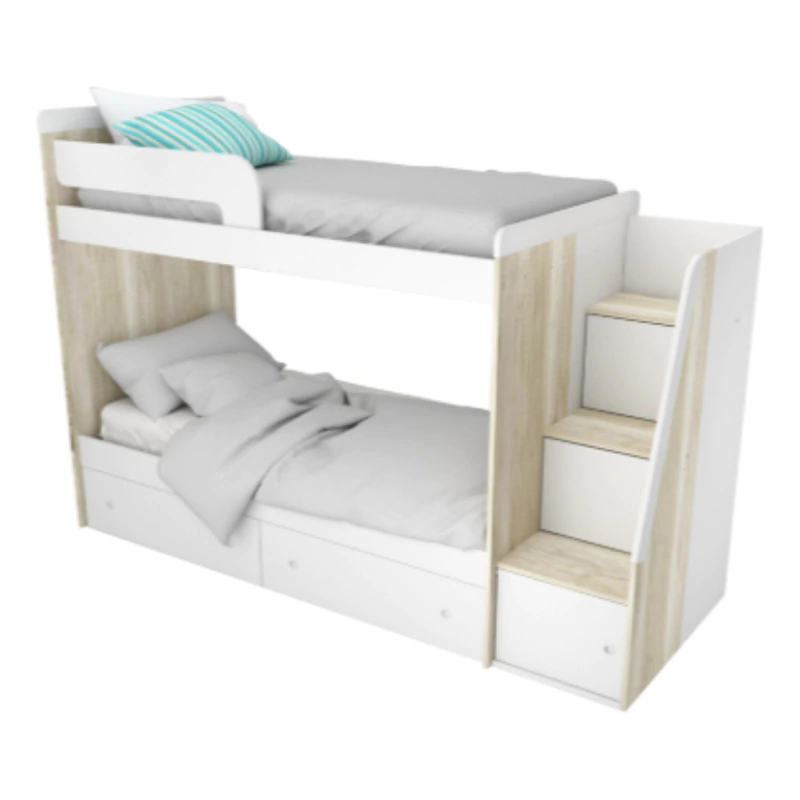 Cama Cucheta con Escalera Lateral. Espacio de Guardado en Escalera con Puertas de Abrir. Fabricado en MDF con Melamina Texturada.