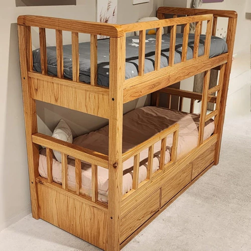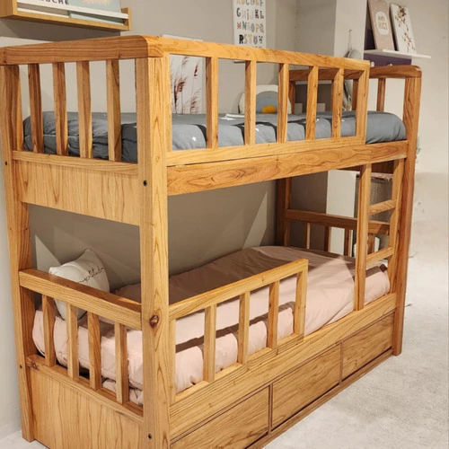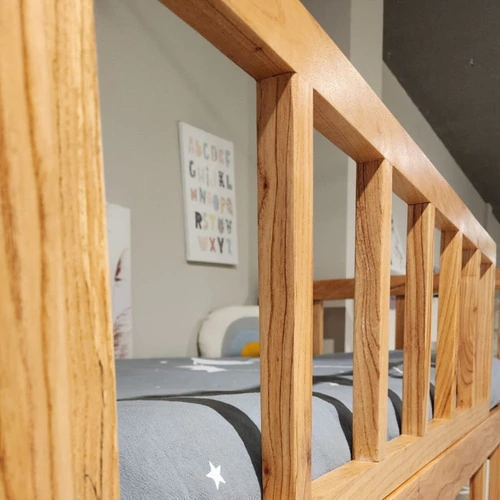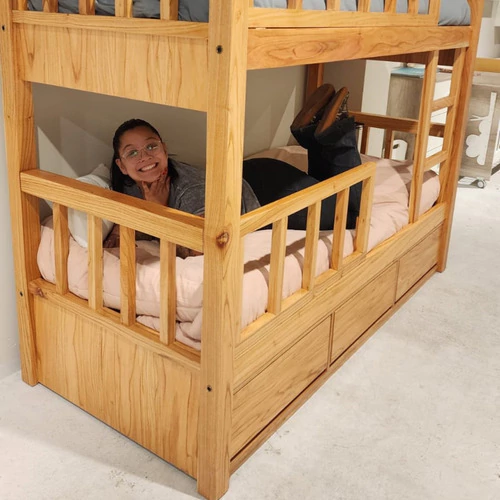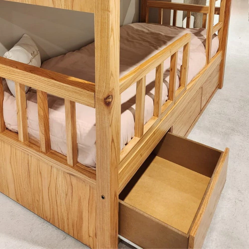 La cama cucheta ARCHIE, cuenta con escalera y barandas superior e inferior protección y 3 cajones inferiores con guías.