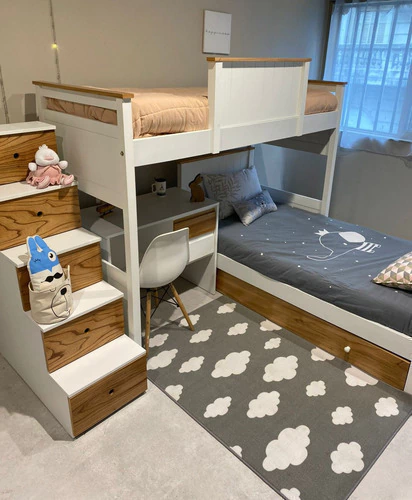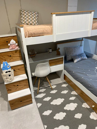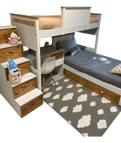 CAMA PUENTE + ESCRITORIO + CAMA CON CAMA CARRO + MUEBLE ESCALERA DE 5 CAJONES.