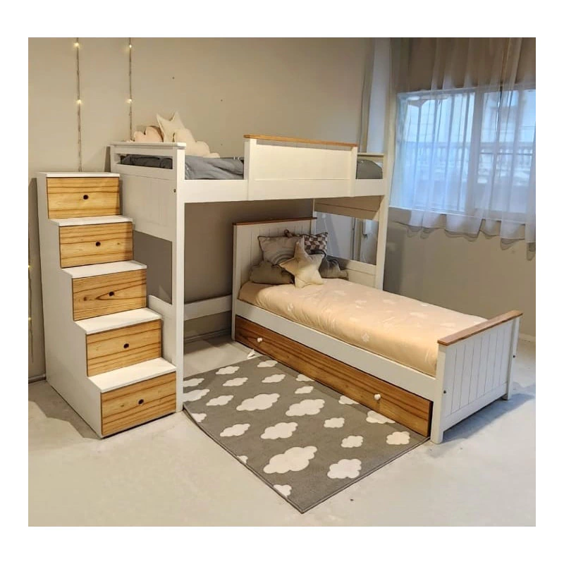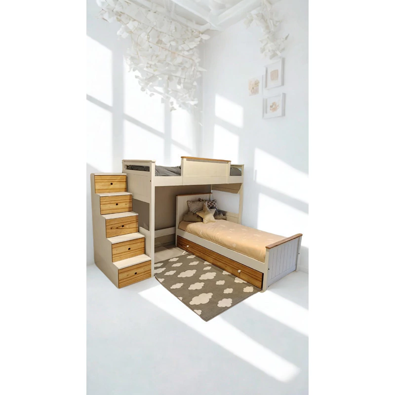 Cama Puente London 1 Plaza Dormitorio Juvenil + Cama 1 Plaza con carro Auxiliar + Mueble Escalera de 5 cajones