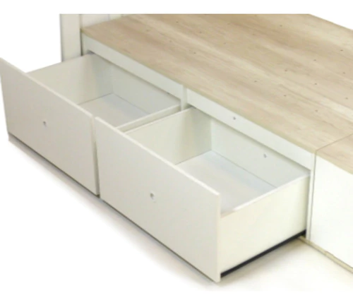 Cama Box con Cajones de Guardado y Zapatero. Posee 3 cajones con amplia capacidad de guardado. El cajón en la piecera tienen una tabla que permite configurarse como zapatero / botinero.