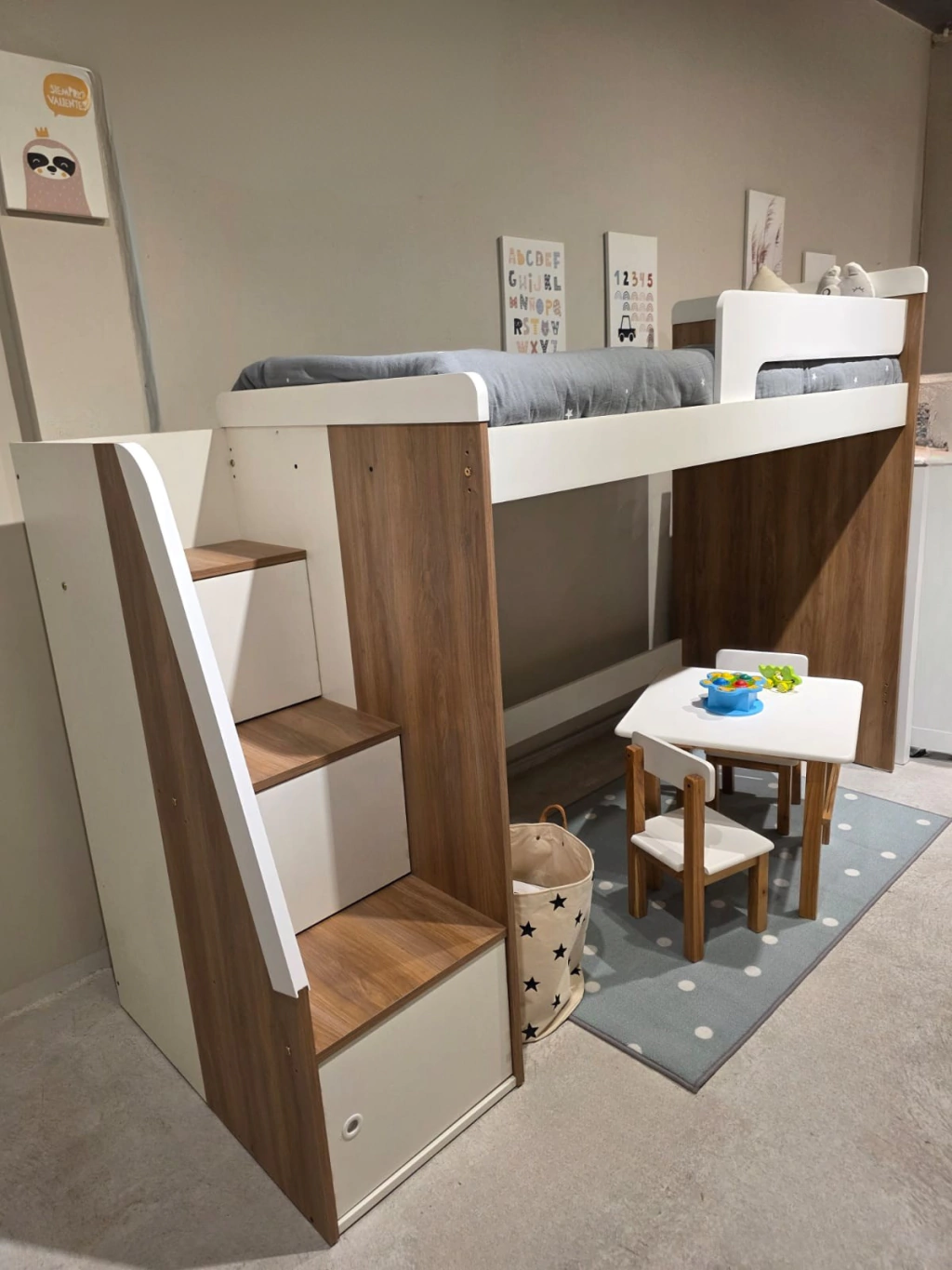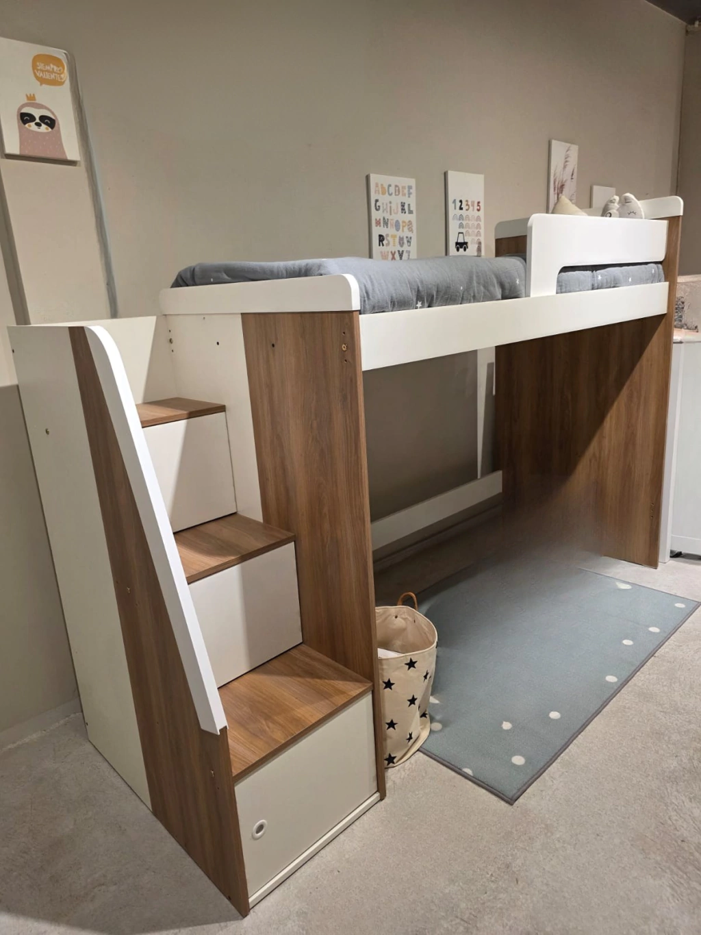 Cama alta tipo puente con escalera lateral. Armado reversible.