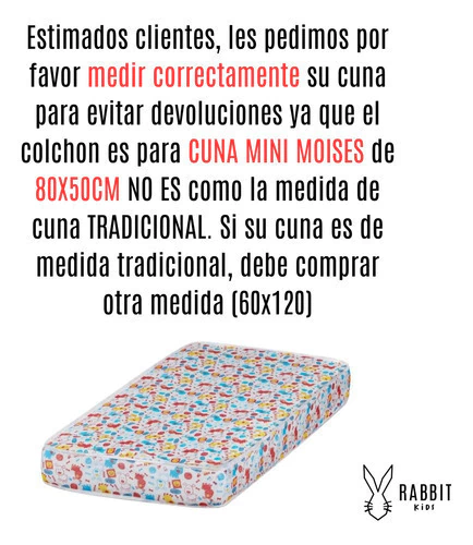 Estimados clientes, les pedimos por favor MEDIR CORRECTAMENTE su cuna para evitar devoluciones ya que el colchón es para CUNA MINI MOISES de 80x50cm NO ES como la medida de cuna TRADICIONAL. Si su cuna es de medida tradicional, debe comprar otra medida (60x120)
