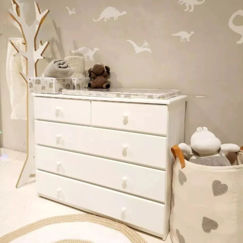 Cuenta con 5 Cajones con guías clásicas metálicas que permiten un deslizamiento suave y sus tiradores son de madera torneados a tono.
