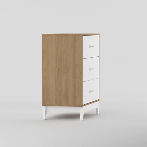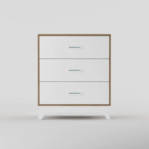 Cómoda 3 cajones Linnea. Estructura de melamina de 18mm. de espesor con frentes de cajones y patas laqueadas blancas. Tirador motivo linnea (imagen adjunta) con colores intercambiables. Los cajones de cómoda vienen con correderas metálicas.