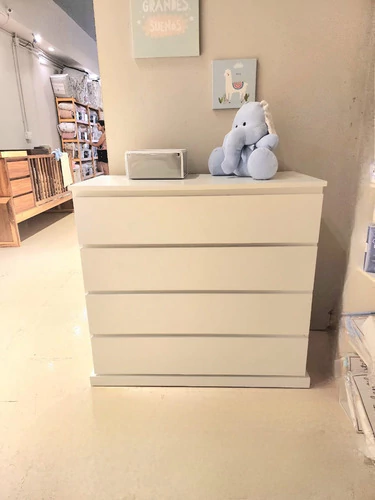 Cómoda de 4 cajones en Mdf con refuerzo de madera maciza (0,95 cm X 0,90 cm X 0,45 cm), cajones con correderas metálicas de primera calidad todo blanco laqueado.