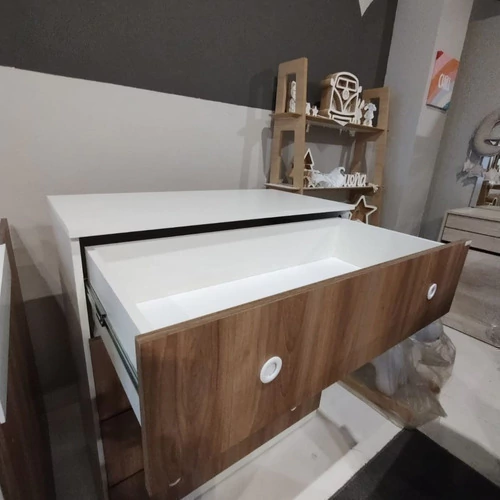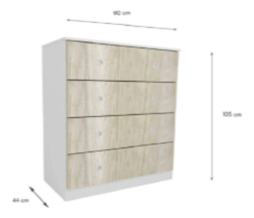 Cómoda Cajonera de 90 cm de ancho con 4 cajones de guardado, con amplia capacidad de guardado. 39 cm de profundidad útiles. Filos de pvc para proteger los cantos. Correderas telescópicas.