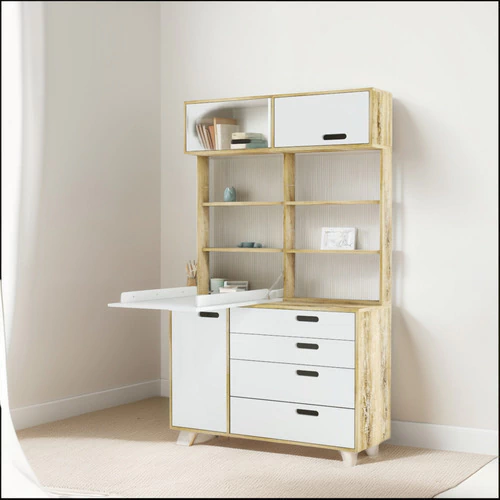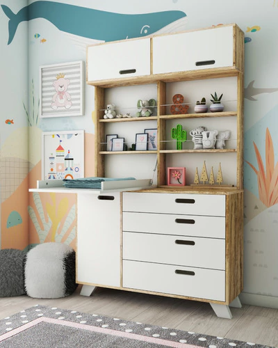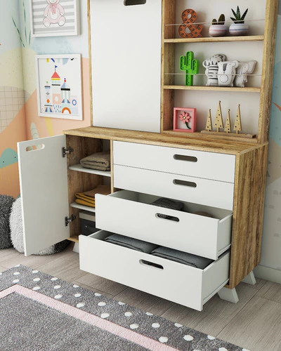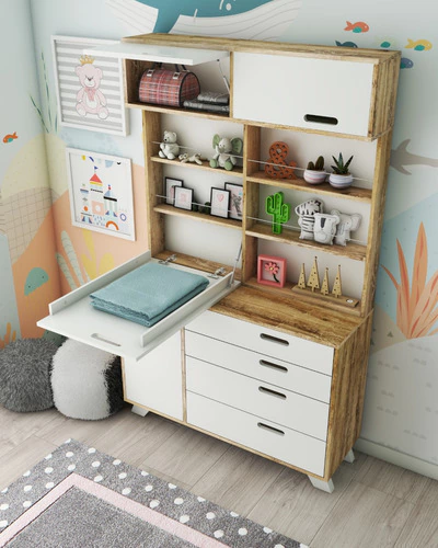 Esta comoda con practico cambiador rebatible, permite tener ordenado el area de cambiado y con amplia superificie de guardado, con sus espacios superiores, estantes, cajones inferiores y estantes con puerta. Mueble de gran solidez y durabilidad