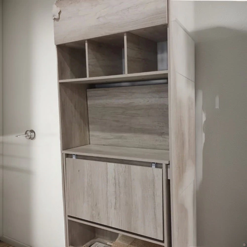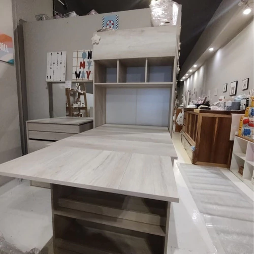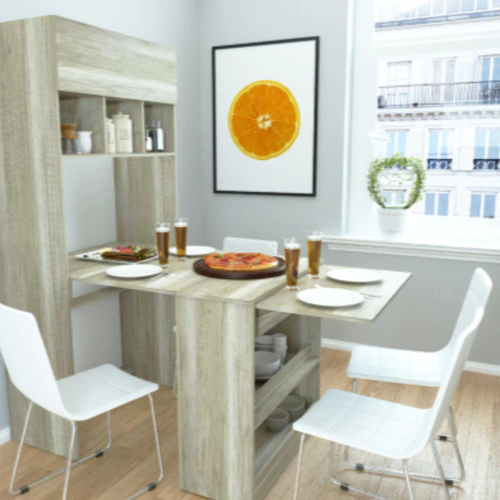 Mesa Escritorio Plegable Multifunción. Recomendada para Monoambientes, Espacios Pequeños y Multifunción. Diseño Original y exclusivo Modo Escritorio, Modo Mesa para 2 o 4 Personas. Espacio de Guardado. Puerta Rebatible con pistón.