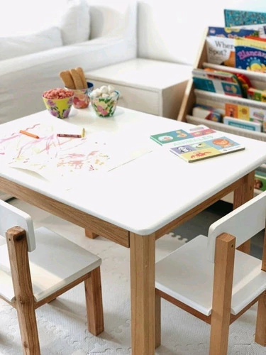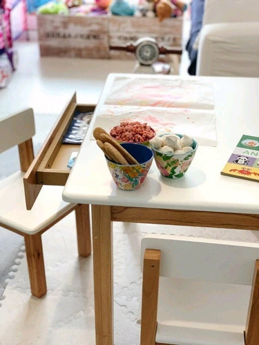 Hermoso Set de 1 mesa con 2 sillas para el cuarto de juego de los niños! Super resistente ya que esta realizada en madera maciza. Muy cómodo para que realicen diferentes actividades lúdicas.