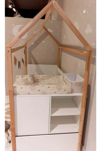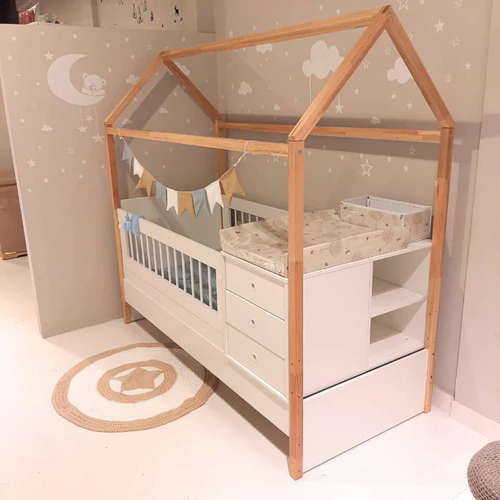 La funcional casita es un modelo que combina una funcional clásica a la que adicionamos una estructura superior que simula ser una casita. Se pude decorar con luces, móviles o banderines para atraer la atención del bebé.