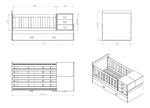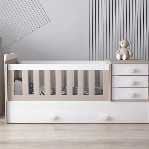 Cuna funcional convertible para colchón de 135 x 75 con carrocama de 1 plaza. Se convierte en cama de 1 plaza, 1 mesa de luz y 1 baulera. Su textura color sahara, suave al tacto le da un acabado Premium. Barandas deslizables y desmontables, cajones con correderas metálicas telescópicas. Contiene tiradores de madera laqueados. La combinación de las texturas + diseño hace que sea confortable al uso y a la vista. Con Carrocama para colchon de 80 x 190.