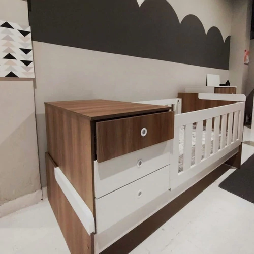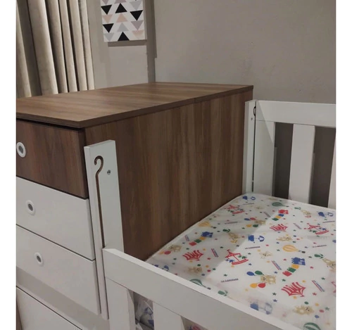 La cuna puede convertirse en una cama de 1 plaza, una mesa de luz con 3 cajones y un mueble de guardado con tapa.