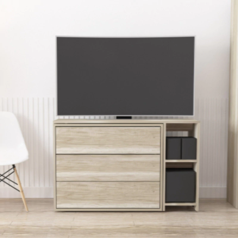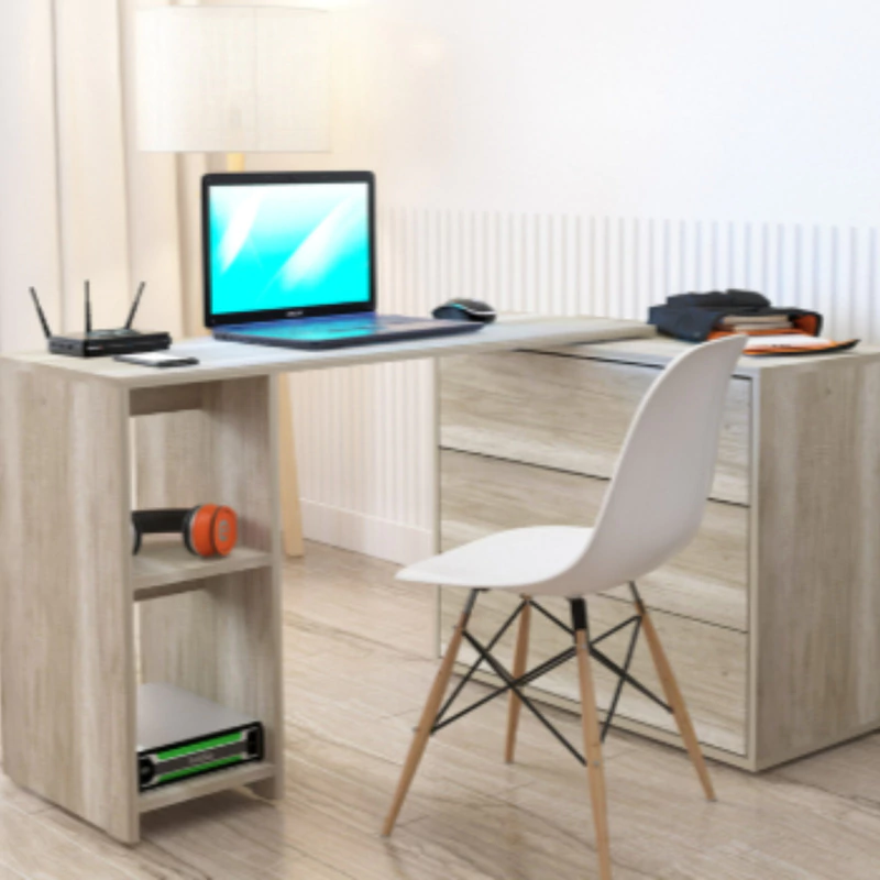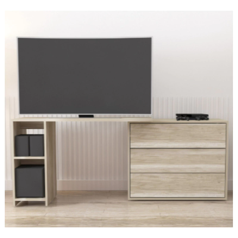 Mesa Escritorio o Rack TV con plataforma giratoria y cajones multifuncionales. Diseñada para maximizar el uso de espacios pequeños, como monoambientes o habitaciones multifuncionales, éste mueble combina un diseño original y exclusivo con gran versatilidad. Puede utilizarse como escritorio, mesa o rack para TV, adaptándose a diferentes necesidades y funciones. Cuenta con 3 amplios cajones con guías telescópicas para un deslizamiento suave y un práctico espacio de guardado que optimiza el orden en tu ambiente.