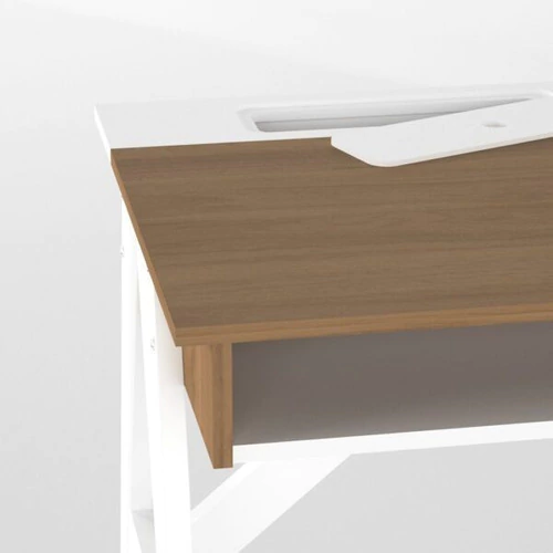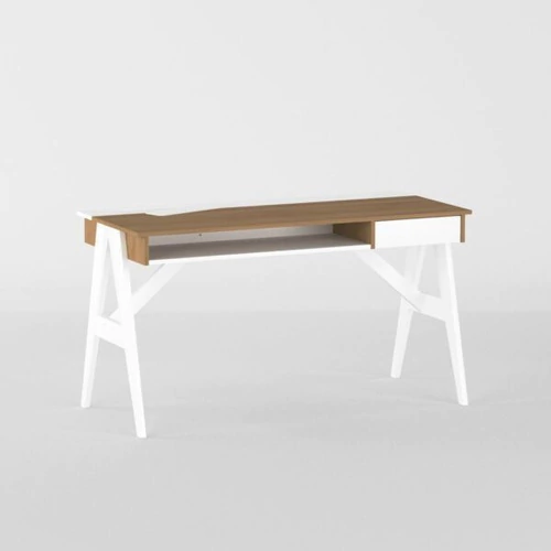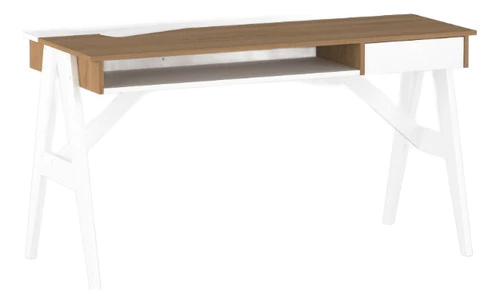 Terminado en Melamina, tapa color serrano combinado con blanco, con espacio de guardado y cajón. En parte superior: tapa para guardado de cables.