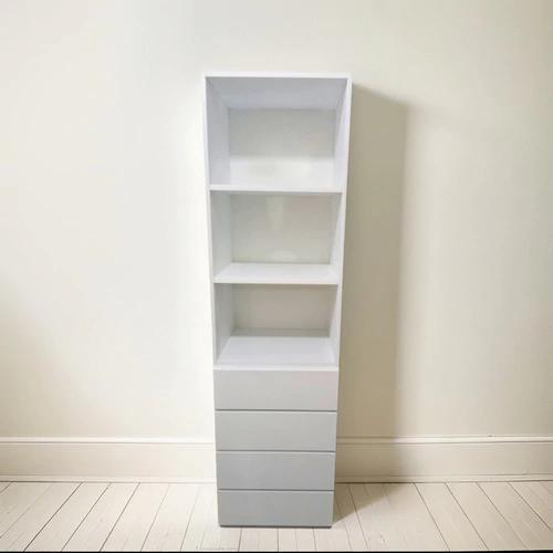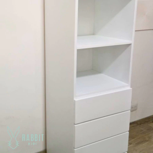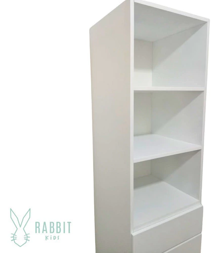 Biblioteca de 180cm de alto x 50cm de ancho y 45cm de profundidad. Cuenta con 3 divisiones de estantes y cajonera en la parte inferior. Los cajones cuentan con guías de metal.