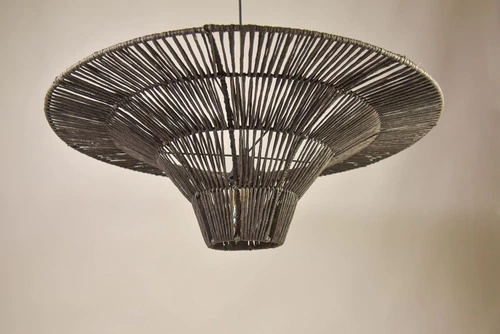 Transformá tus espacios con "Martini", una lámpara colgante de diseño exclusivo, tejida a mano en hilo kraft color tostado. Su forma única, inspirada en una copa de martini, aporta un toque moderno y cálido a cualquier ambiente.