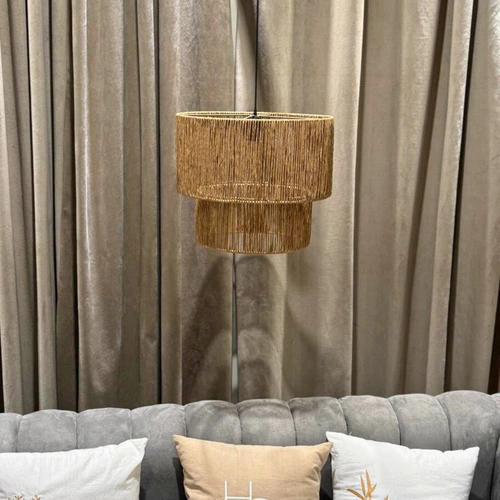 Tejida a mano en hilo kraft negro, su estructura de doble tambor superpuesto crea un juego de volúmenes y sombras que aporta profundidad, calidez y estilo moderno a cualquier espacio.