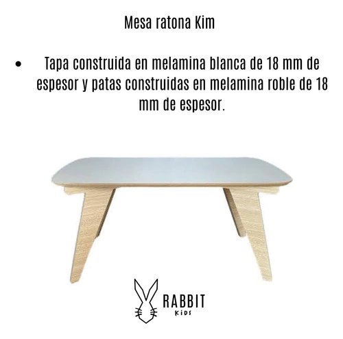 - Material: Tapa construida en melamina blanca de 18 mm de espesor y patas construidas en melamina roble de 18 mm de espesor.