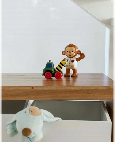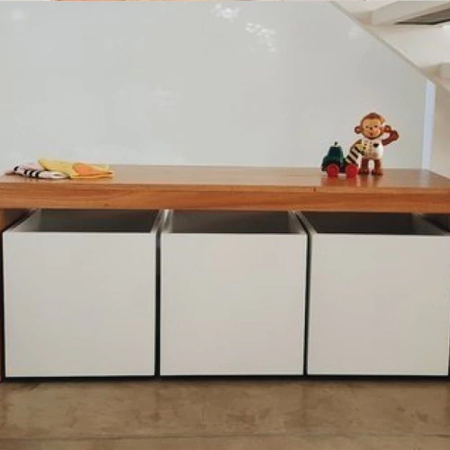 Medidas: Mesa de 1,30x40x50 cm y 3 jugueteros de 40x40x40 cm con ruedas ocultas