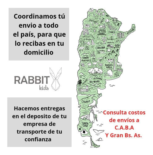 ***EN CASO DE ENVIO POR EMPRESA DE TRANSPORTE, EL COSTO DEL EMBALAJE ES DE UN 10% DEL PRECIO DEL PRODUCTO. EL MISMO SE ABONA MEDIANTE ALIAS A LA CUENTA DE MERCADO PAGO DE RABBIT KIDS***